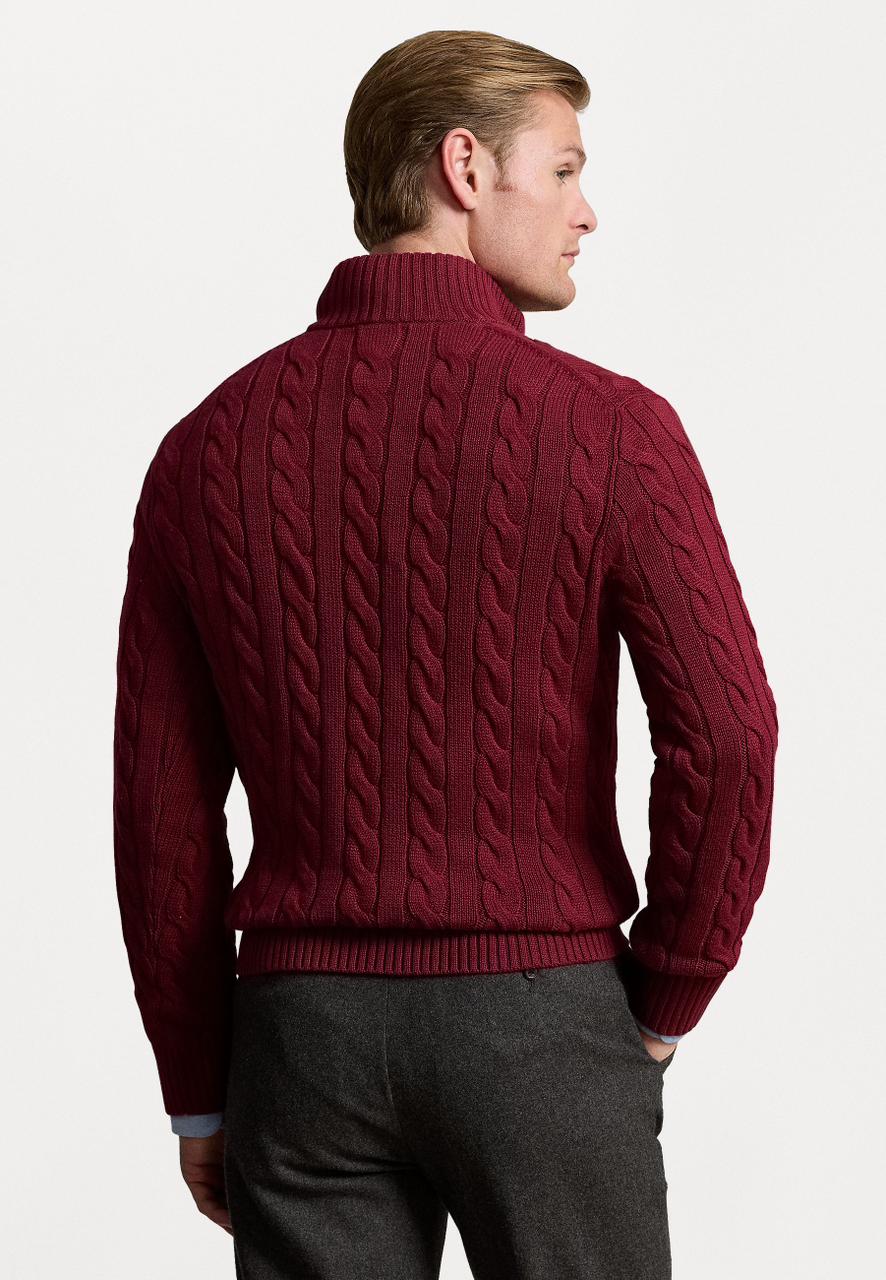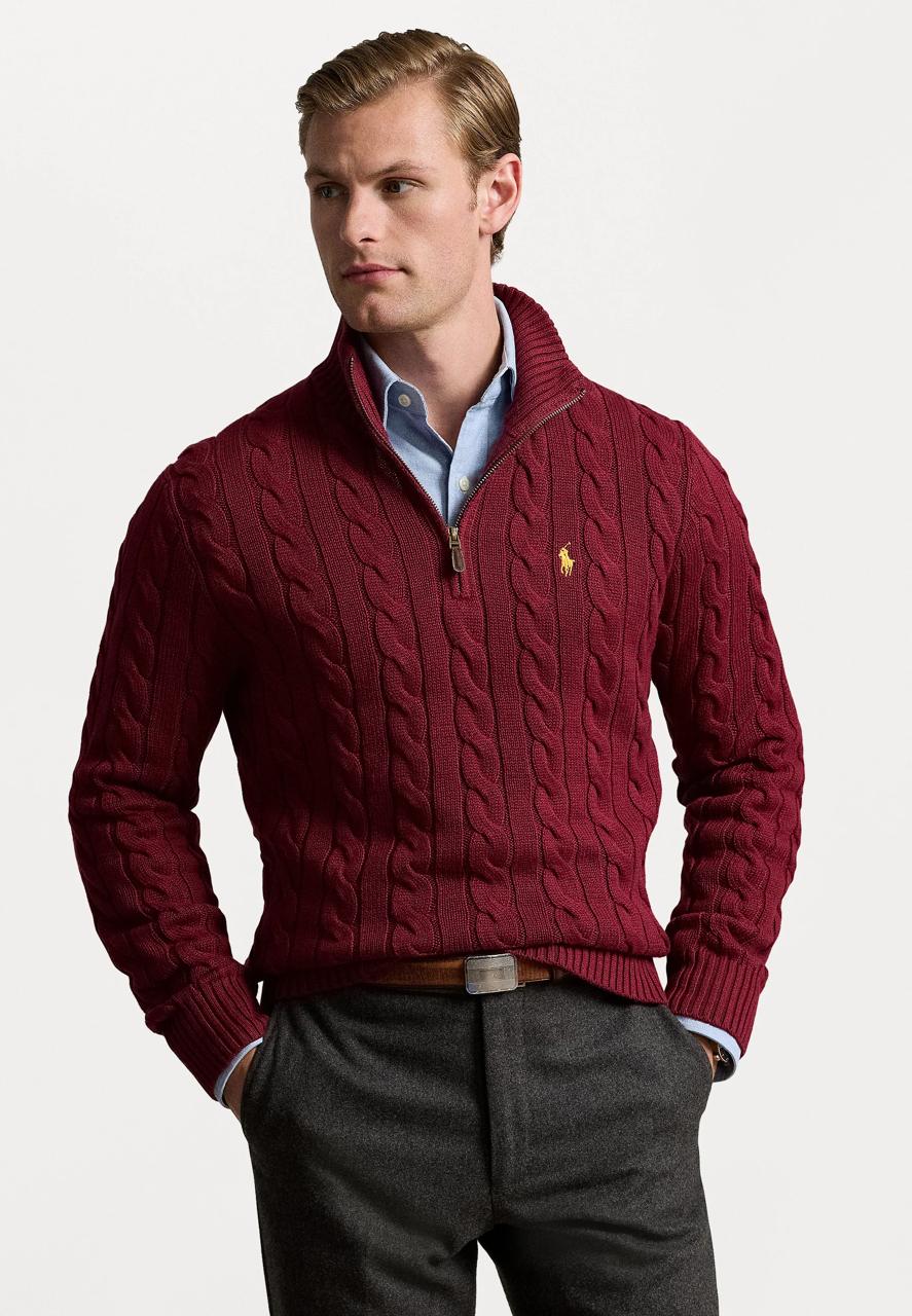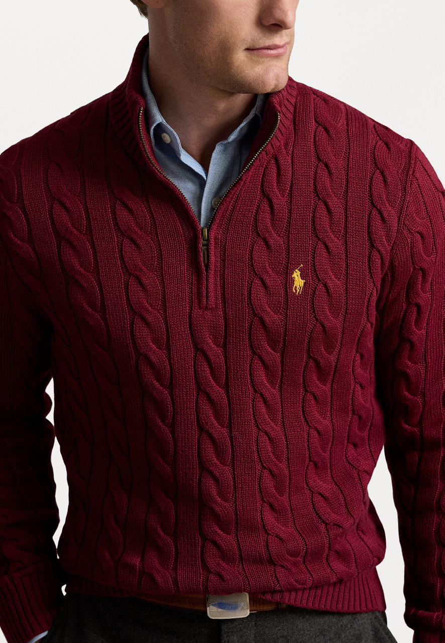 - Rib-knit mockneck. Quarter-zip placket. Custom-developed suede zip pull with a “Polo” logo.