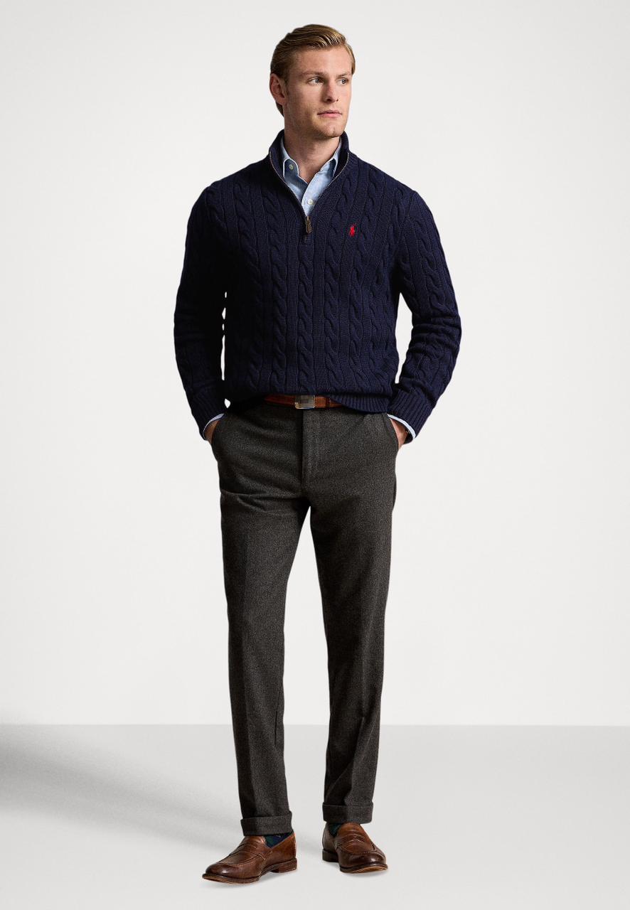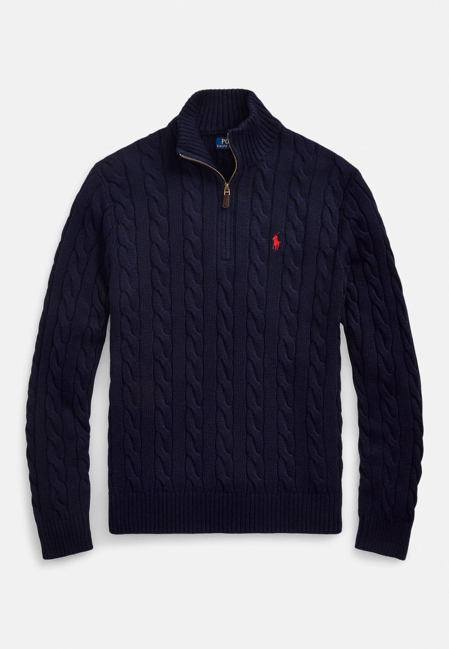 - Rib-knit mockneck. Quarter-zip placket. Custom-developed suede zip pull with a “Polo” logo.