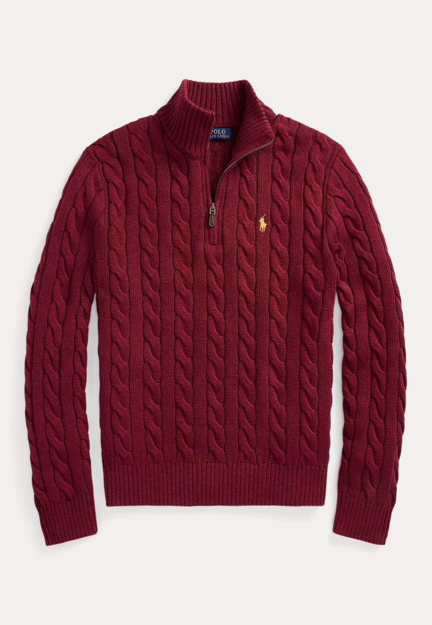 - Rib-knit mockneck. Quarter-zip placket. Custom-developed suede zip pull with a “Polo” logo.